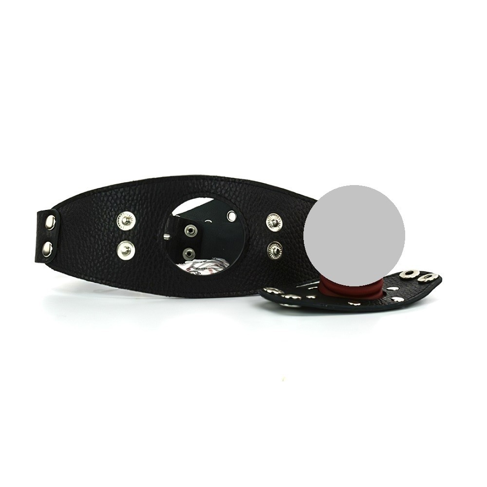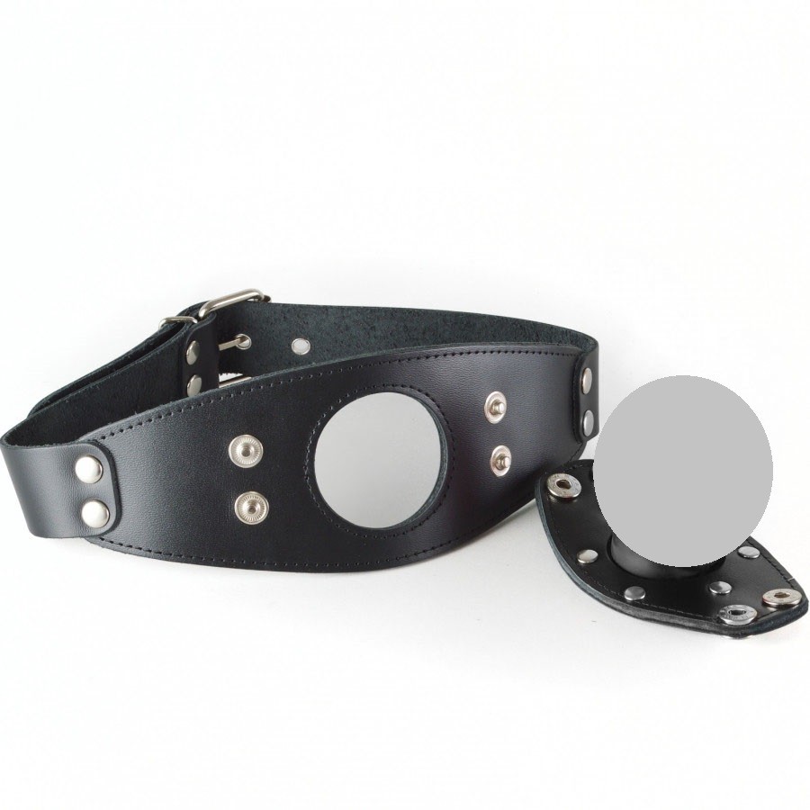 Трансформирующийся кляп, в виде широкой кожаной полоски с отверстием для рта, меняет свою функциональность при помощи пристёгивающегося кожаного щита с фаллосом из натурального латекса.
