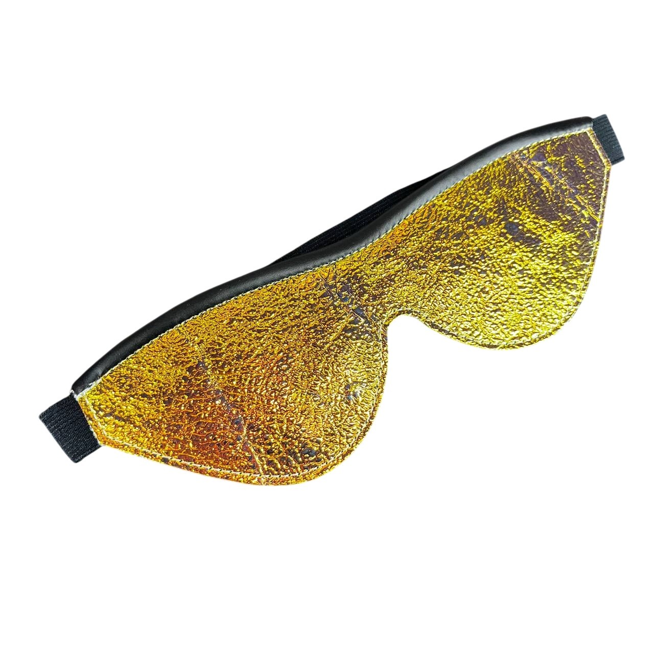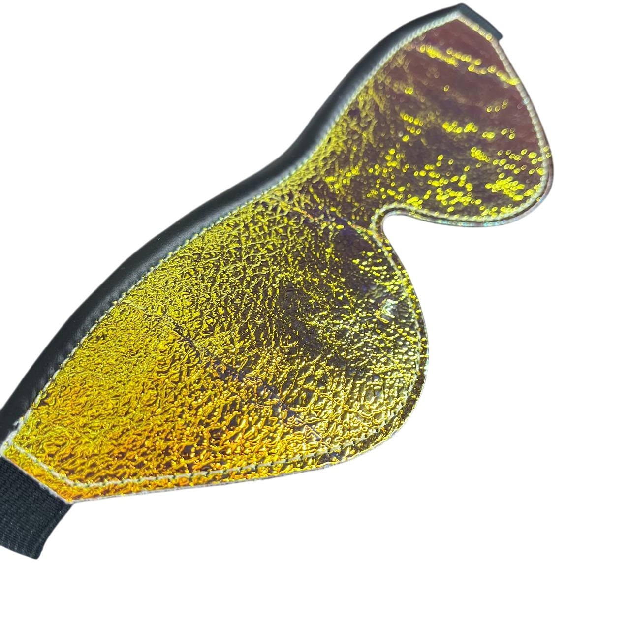 Маска изготовлена из черной натуральной кожи, лицевая сторона декорирована голографическим материалом, основным цветом которого является золотистый, но при отражении окружающих цветов, принимает различные нежные оттенки. Маска для сексуальных игр может быть одна, но при каждом использовании, она будет пробуждать новые фантазии, а учитывая, что данный девайс может приобретать различные цвета в зависимости от цветового пространства и вызывать она будет все новые и новые ощущения.