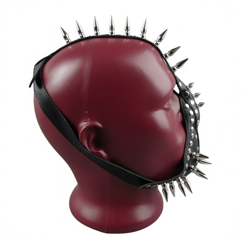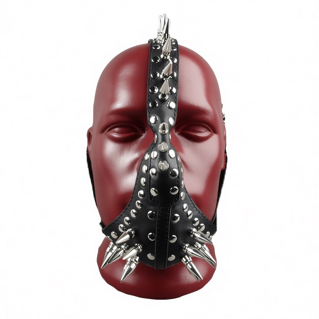 Маска выполнена из двух слоев мягкой кожи, выпуклой формы, заходящая на подбородок, с наносьем, декорирована маска металлической фурнитурой и шипами в нижней части. Крепиться на голове при помощи ремешков с пряжками и подгоняется по размеру головы. Один ремешок проходит сверху головы, другой поперек, благодаря этому маска плотно и надежно сидит на голове.