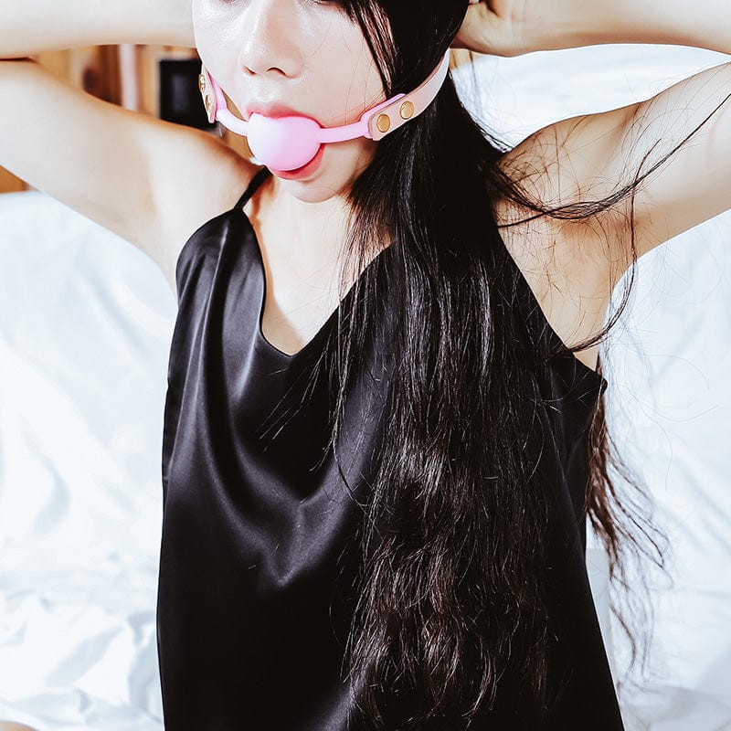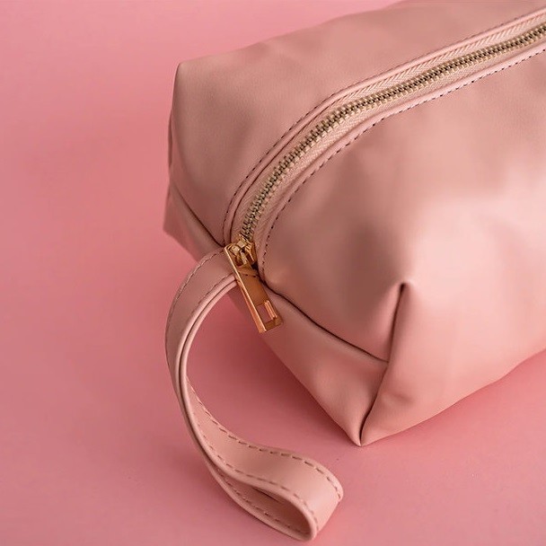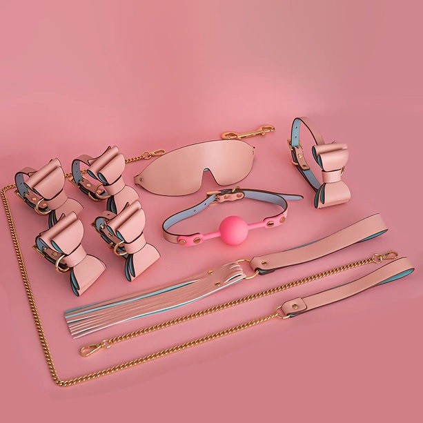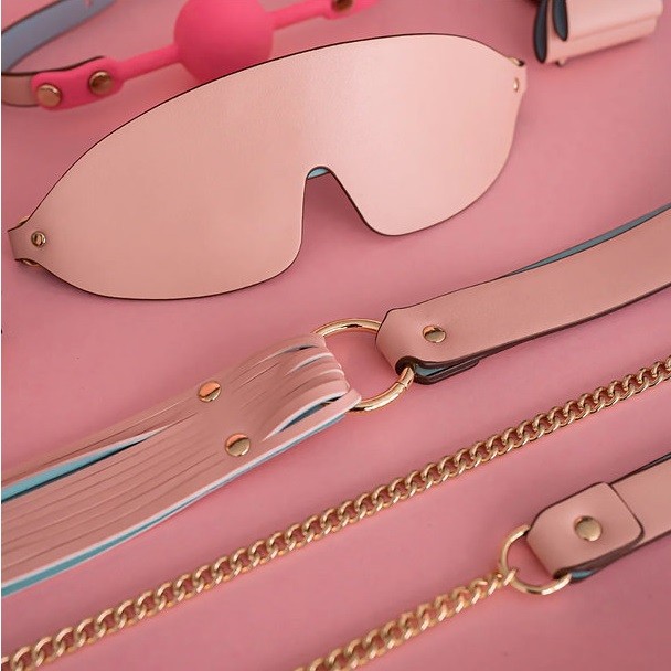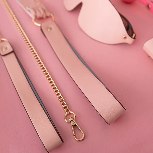 БДСМ-набор из искусственной кожи нежно-розового цвета, упакованный в удобную сумку.