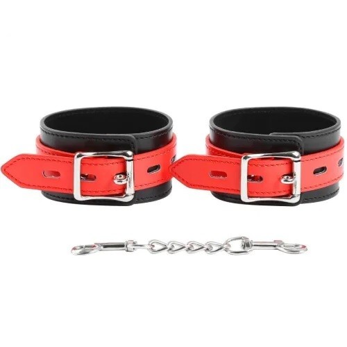Оковы для фиксации ног черного цвета с красным ремешком. Отлично сочетаются с наручниками (приобретаются отдельно)