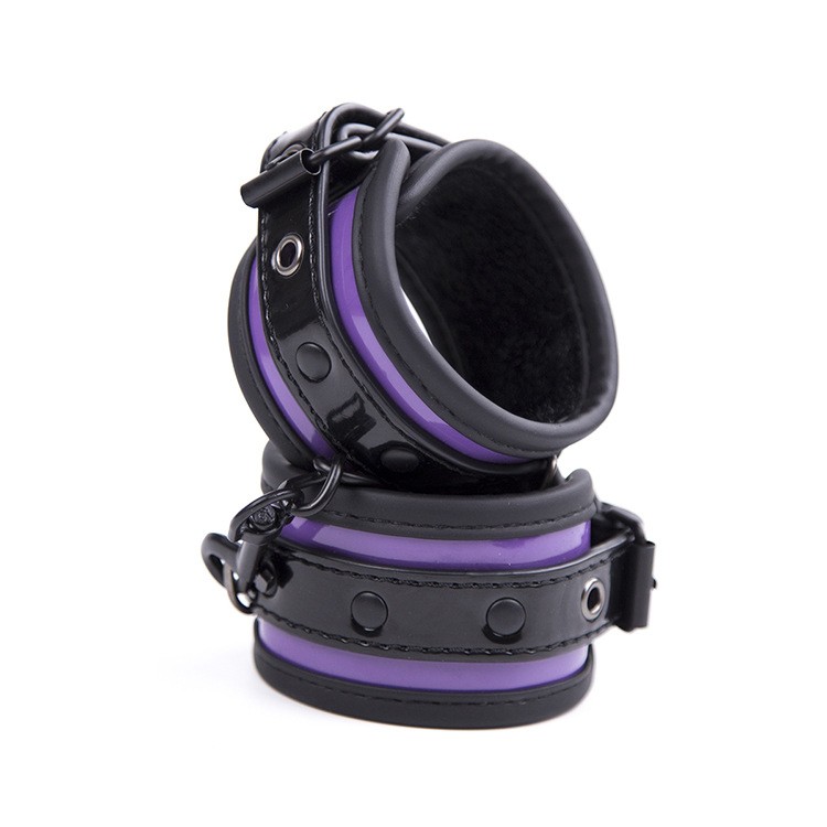 Лакированные наручники с фиолетовым отливом, с карабинами на цепи и черной фурнитурой, выглядят очень привлекательно. Однозначно, они станут главным украшением в вашей ролевой игре.