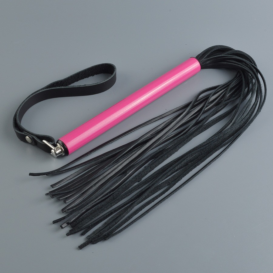 Плеть изготовлена из натуральной кожи черного цвета. Рукоять металлическая розовая. Общая длина около 47 см.
