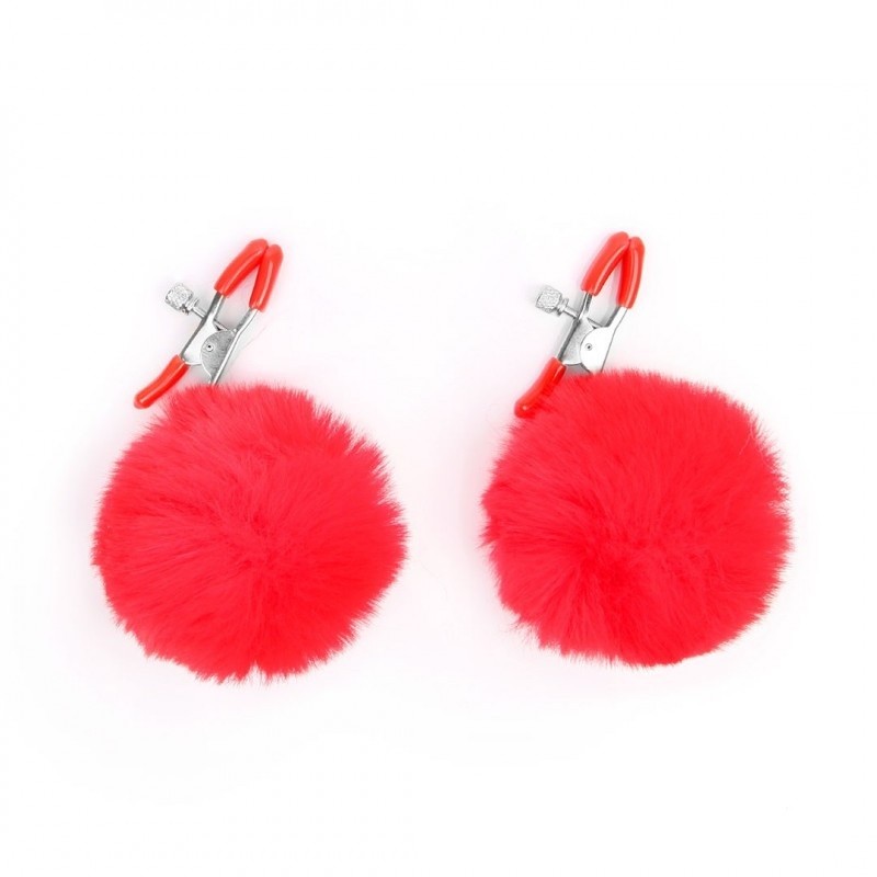 Оригинальные зажимы для сосков, украшенные меховыми помпонами, придутся по вкусу любителем БДСМ-аксессуаров. На концах изделий имеются специальные эластичные накладки, которые препятствуют сильному сдавливанию и травмированию сосков. На каждом зажиме предусмотрен регулировочный винт, позволяющий контролировать силу сдавливания.
