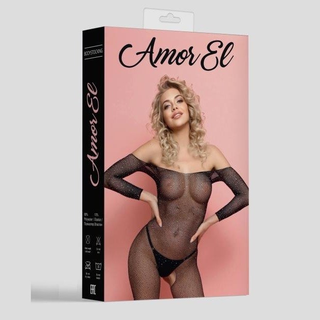 Боди-комбинезон с рукавами 3/4 и открытым доступом. Дизайн выполнен в виде мелкой сетки со стразами. Его можно носить как полностью на плечах, так и приспустить на руки.