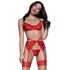 Включает тонкие трусики в тон и черные чулки с кружевным верхом.