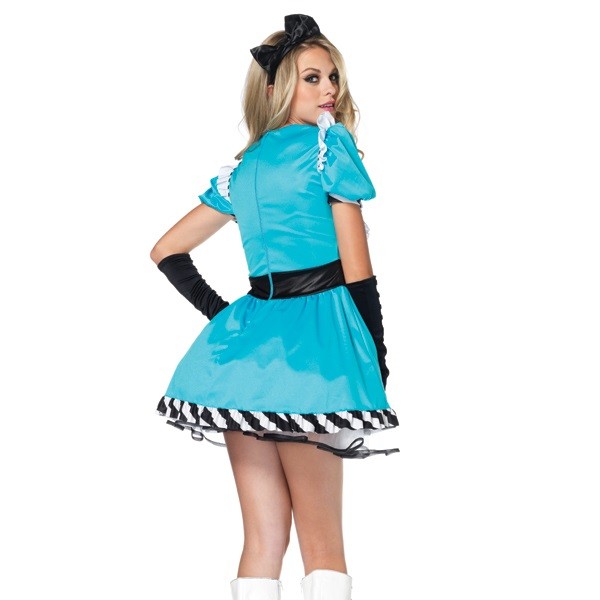 Костюм «Алиса в стране чудес» состоит из очаровательных платьев из атласа голубого материала, украшенные белыми и черными элементами.