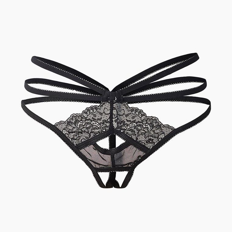 Трусики с высокой талией подчеркивают все изгибы женского тела. Комбинация кружева, эластичной сетки и черных лент выглядит провокационно, и, в тоже время, нежно.