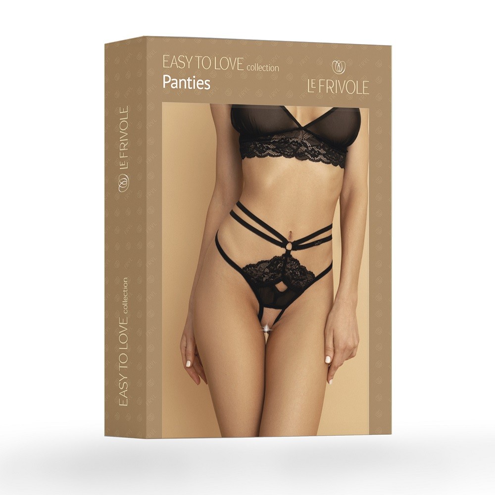 Экстравагантные черные трусики с доступом и переплетением лент сзади подчеркивают все изгибы женского тела.