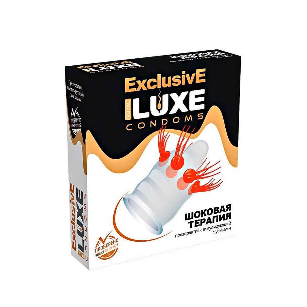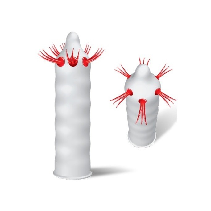 Презервативы Шоковая терапия – это совмещение безопасности и острых ощущений, которые вы можете подарить своей партнерше. 6 пучков красных усиков расположены прям на верхушке презерватива, поэтому их воздействие женщина будет чувствовать даже в глубинных чувствительных зонах влагалища.