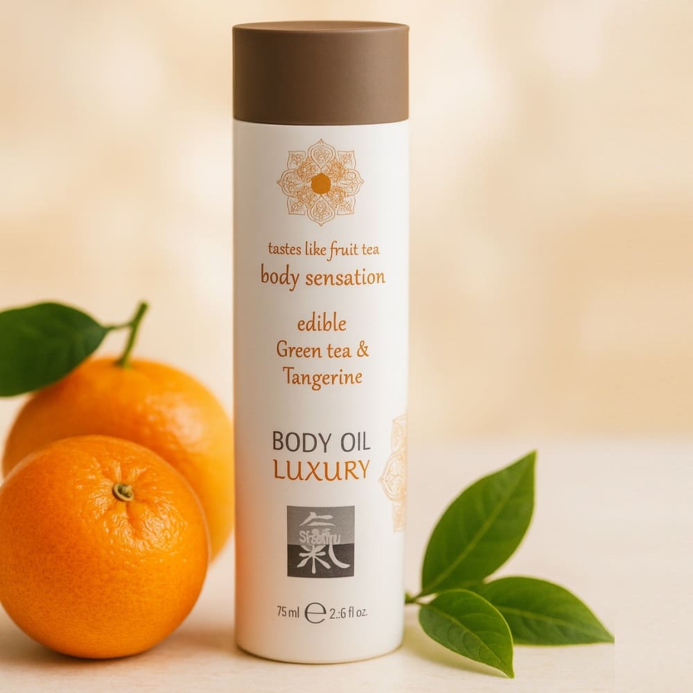 Съедобное массажное масло для тела Shiatsu — зеленый чай и мандарин. Это чувственное массажное масло с легкой текстурой, идеальное для эротического массажа. Пикантная особенность серии — масла съедобны.