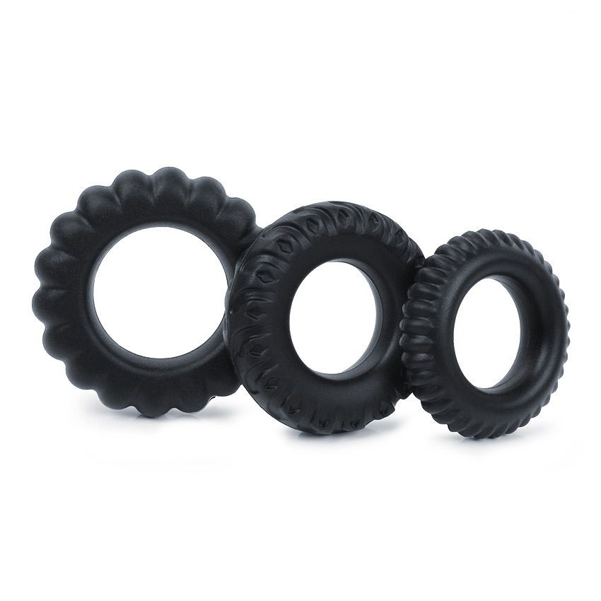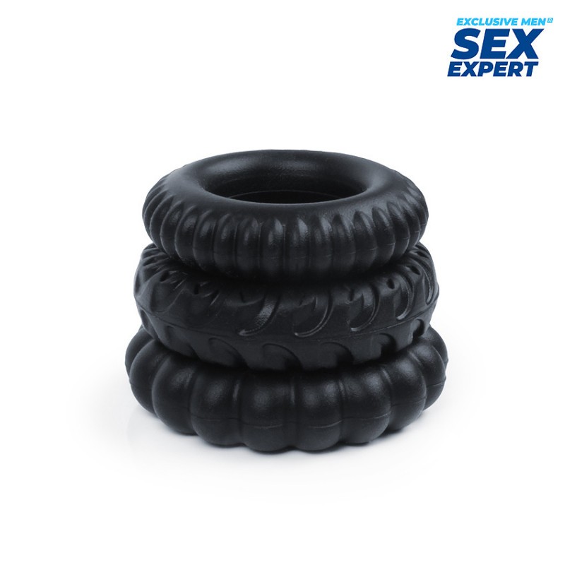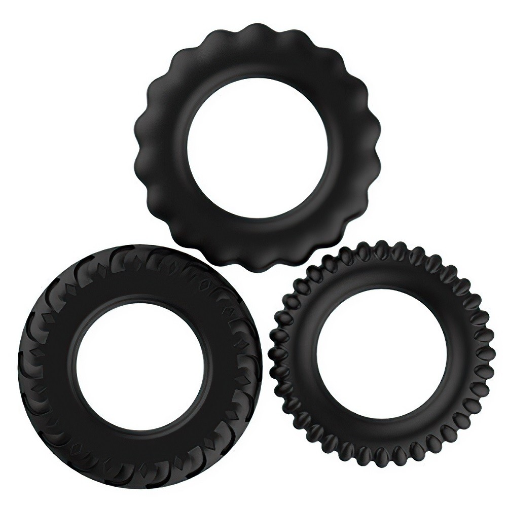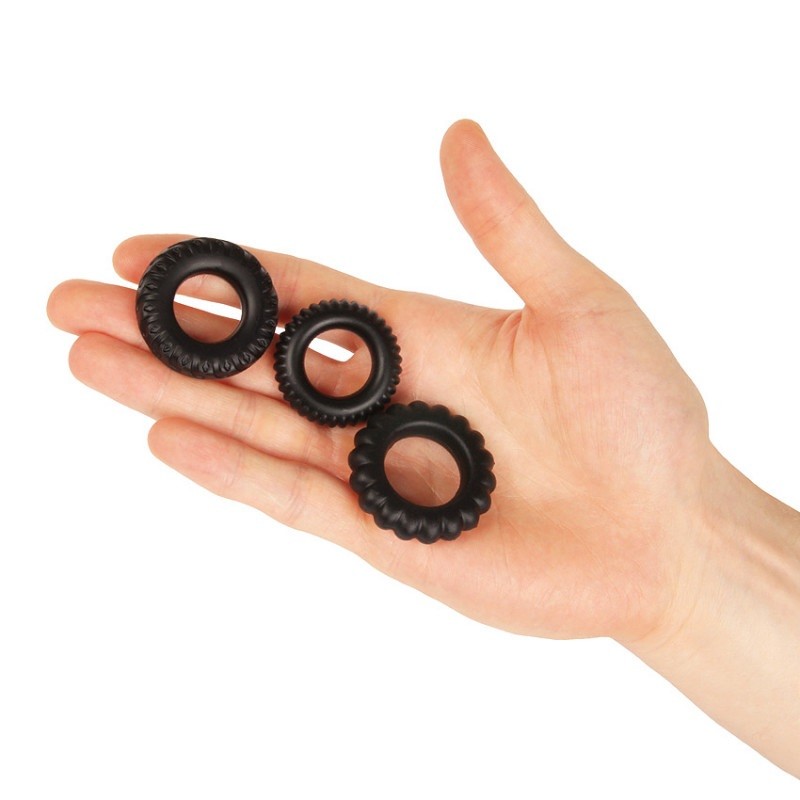 Набор из трех эрекционных колец с разным внешним рельефом. Рельеф на поверхности стимулирует женщине влагалищный вход и усиливает возбуждение. С помощью эрекционного кольца мужчина может увеличить время эрекции.