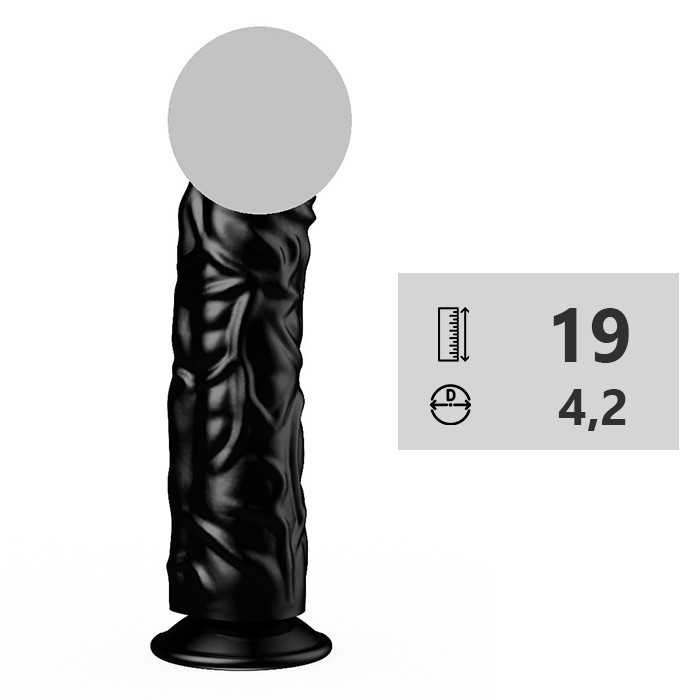 Интим-игрушка выполнена в форме полового члена, с сильно выпуклыми венами по всей длине ствола и ярко-прорисованной головкой. Без мошонки. Цвет черный.