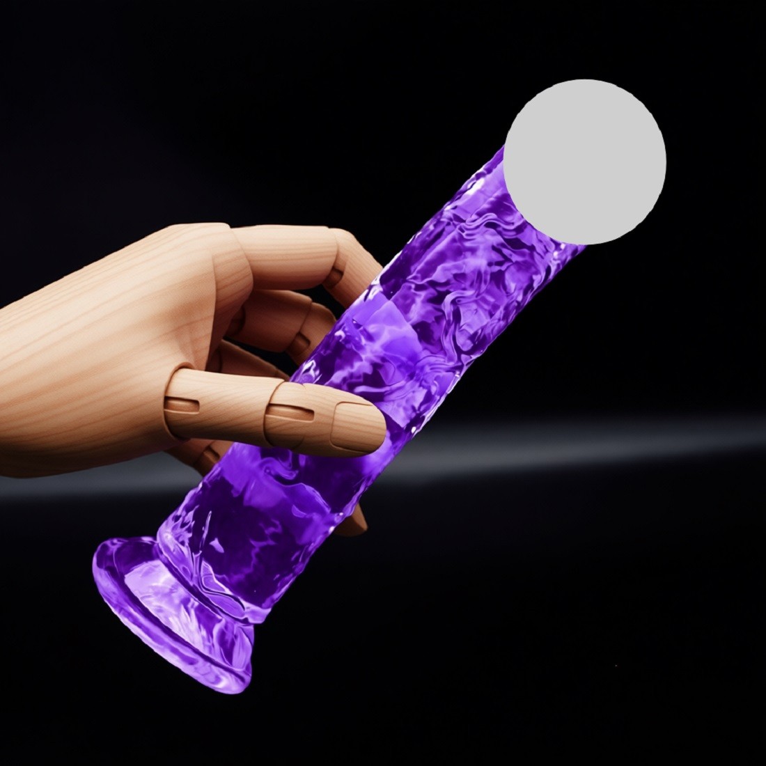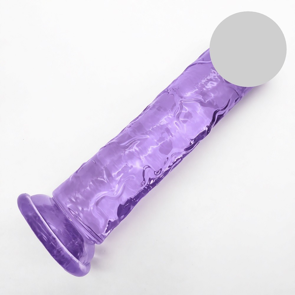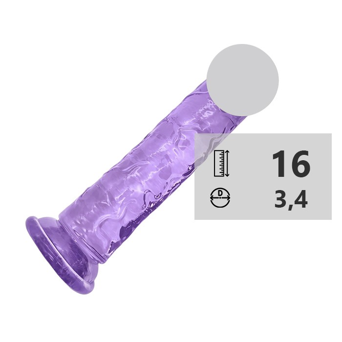 Прозрачно-фиолетовый гелевый фаллоимитатор, ровный ствол отличается крайне реалистичной фактурой; на поверхности заметны неровности, впадинки, в точности, как у живого прототипа.