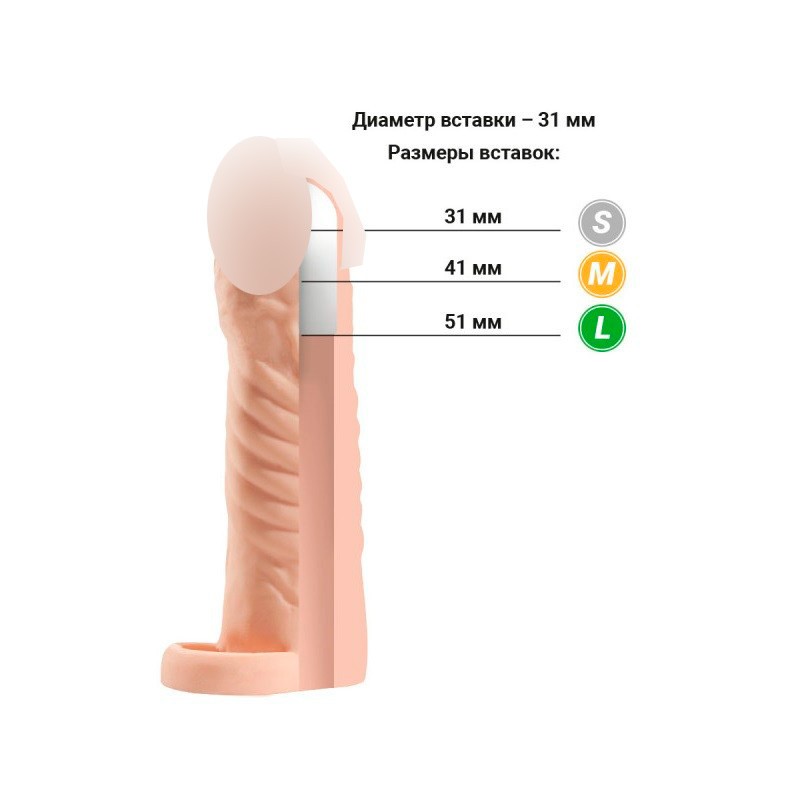 Удлиняет на 5 см, подходит для длины полового члена - 10-11 см.