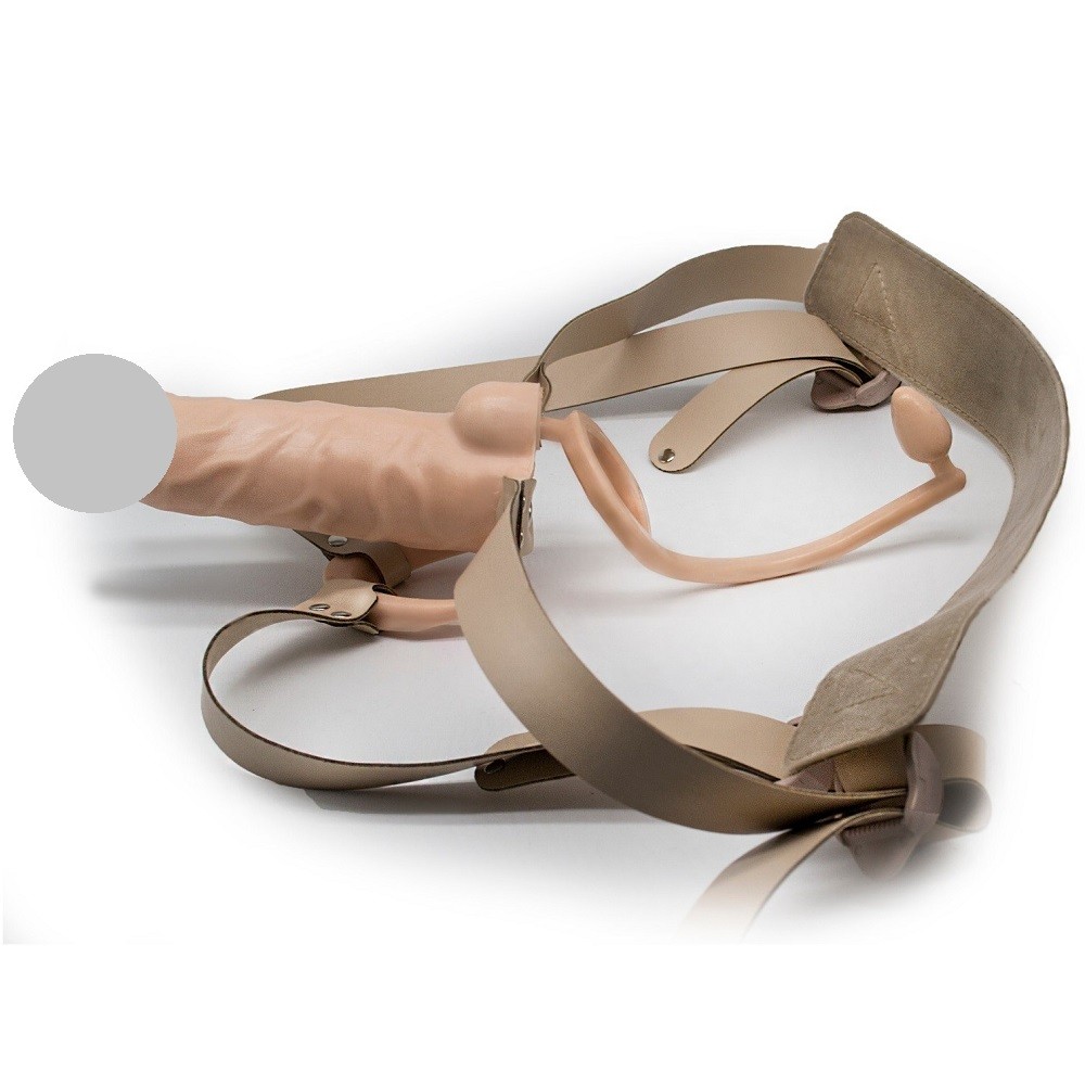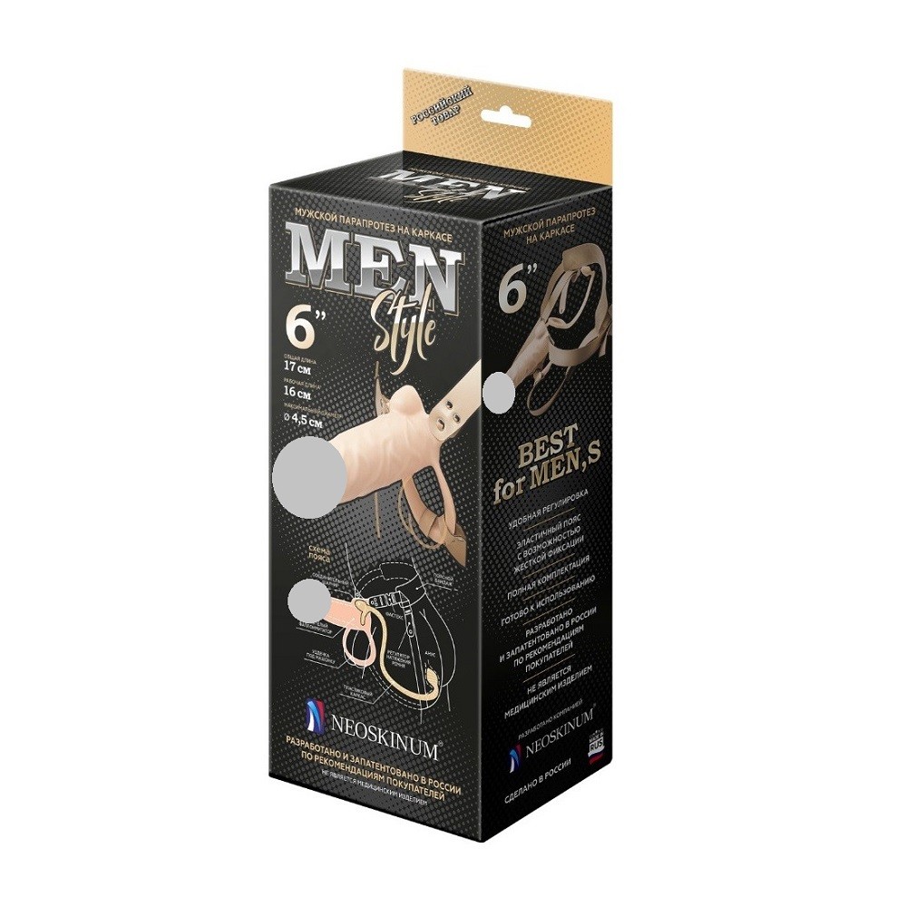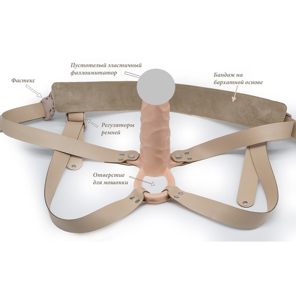 Фаллопротез для мужчин имеет четыре кожаных ремешка для закрепления на теле. Снизу два из них «обходят» мошонку которая выполняет функцию комфортной фиксации вокруг яичек. Небольшие шарообразные коннекторы на концах каркаса укрепляются с одной стороны в анальное отверстие, с другой стороны подвижно удерживают пустотелую насадку на фаллос.