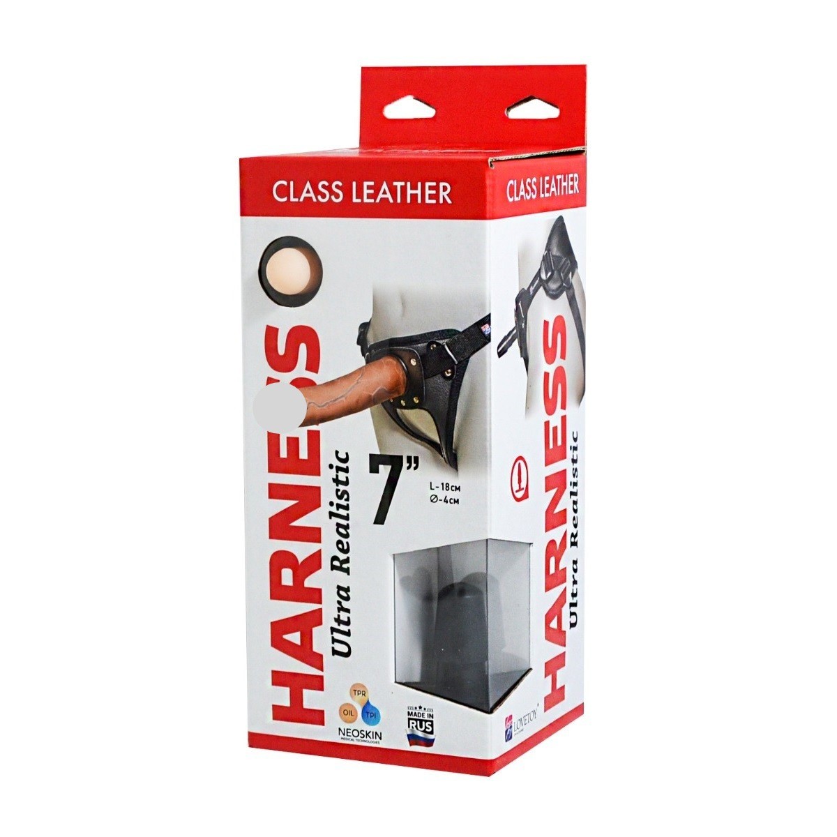 Комплект из трусиков с насадкой. Трусики изготовлены из кожи, комфортные и мягкие, удобно регулируются до необходимого размера. Насадка в виде члена без мошонки, изготовленная из неоскин, имеет небольшую головку розового оттенка и прорисованные вены.