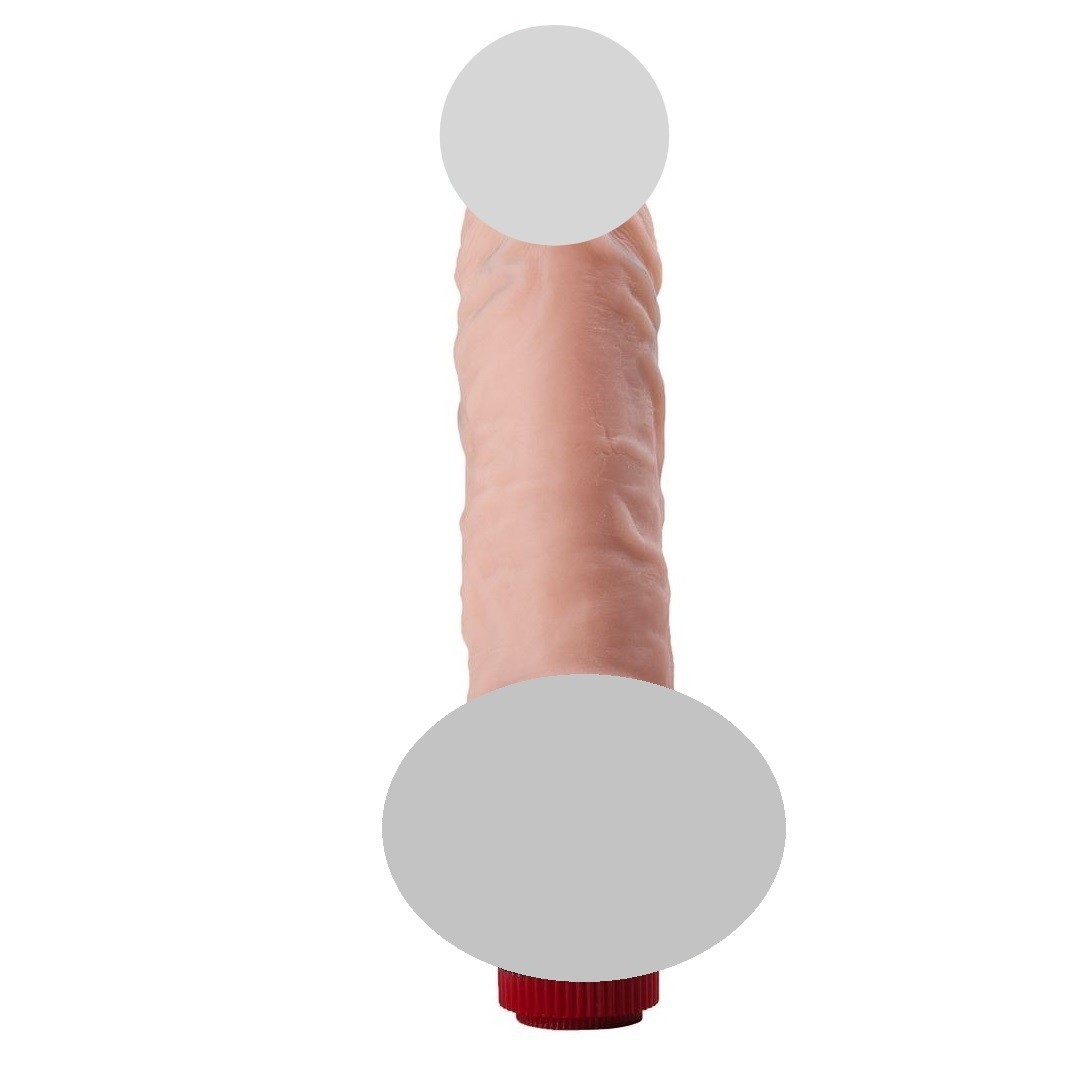 Крупный вибромассажёр телесного цвета с мошонкой. Имеет форму члена с ярко выраженной головкой розового оттенка.