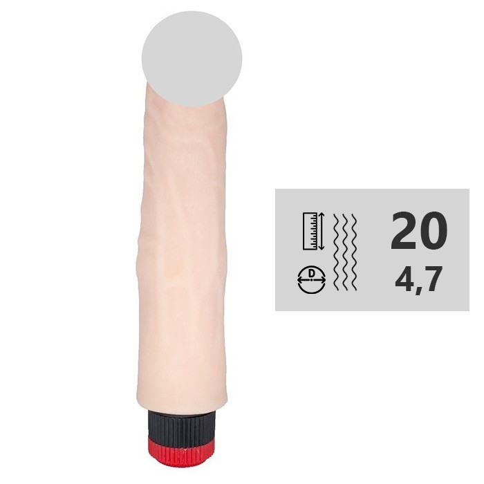 Изделие имитирует настоящий половой член мужчины, головка нежно-розового оттенка. Вибрация плавно регулируется в своем основании при помощи специального колёсика.