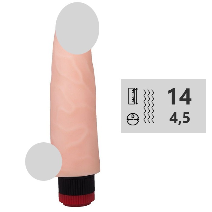 Вибратор-реалистик телесного цвета. Имеет форму члена с ярко-выраженной головкой (розового оттенка) и небольшой мошонкой, рельефный, выполненный из материала неоскин, не имеет швов.