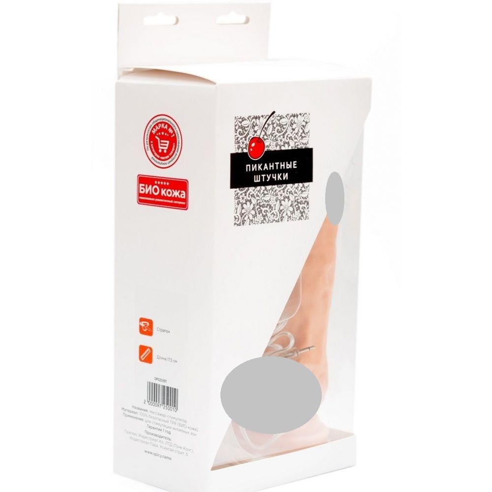 Вибромассажёр обладает чёткими контурами и хорошо обозначенным краем, под которым заметны резко очерченные складки, имитирующие крайнюю плоть.