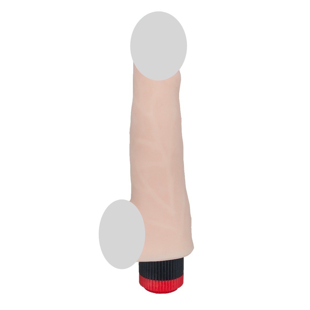 Вибромассажёр телесного цвета с небольшой мошонкой. Имеет форму члена с слегка зауженной головкой розового оттенка. Необычайно приятный, рельефный, выполненный из «Неоскин», передающий эффект мягкой реалистичной текстуры кожи, не имеет швов.