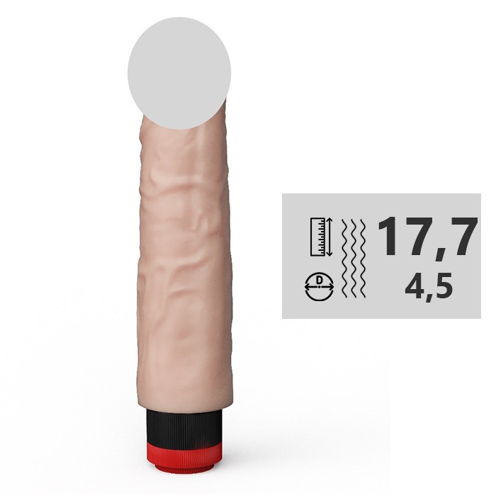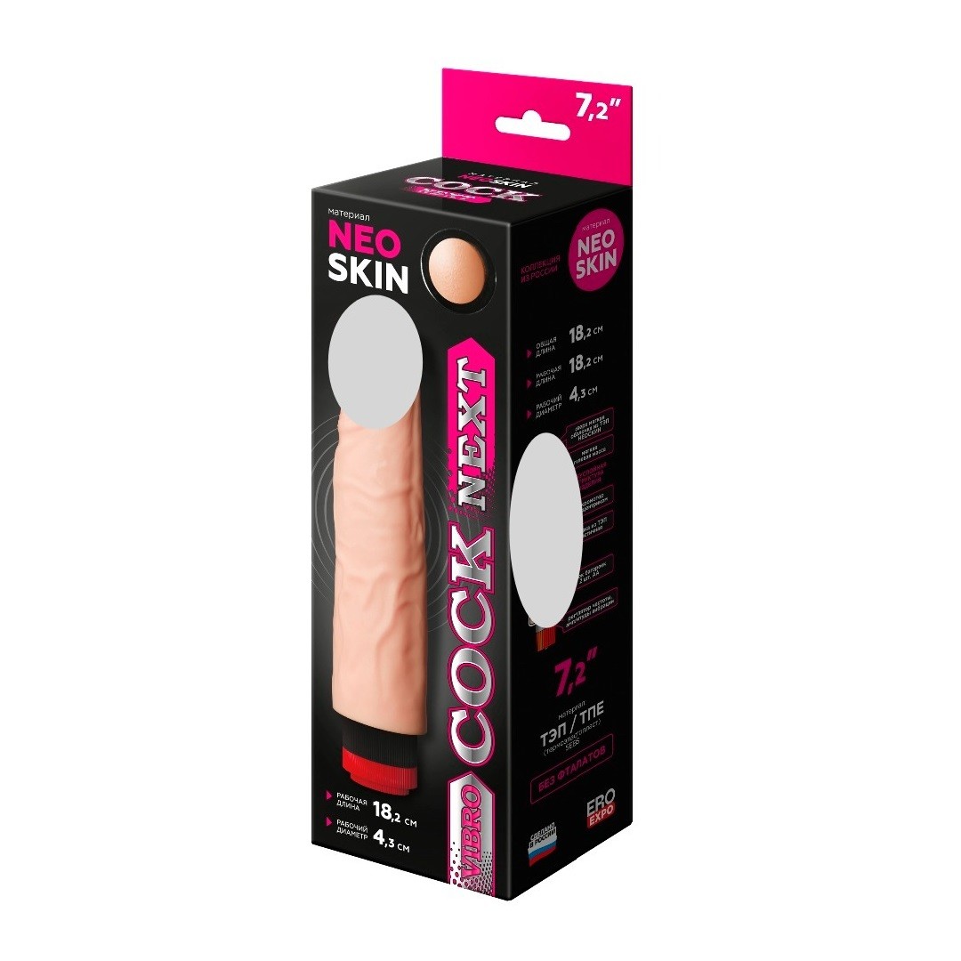 Вибромассажёр без мошонки, телесного цвета. Имеет форму члена с ярко выраженной головкой. Необычайно приятный и рельефный; выполнен из материала «неоскин», передающий эффект мягкой реалистичной текстуры кожи; не имеет швов.