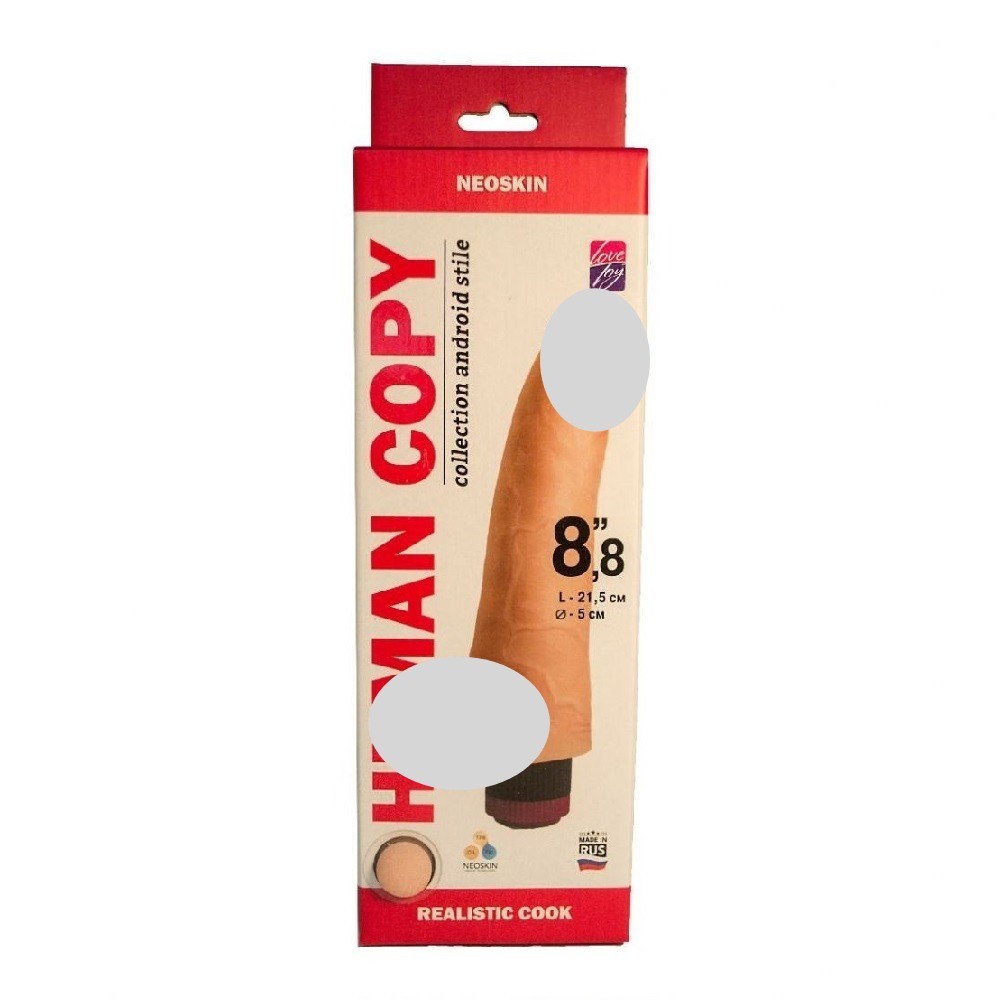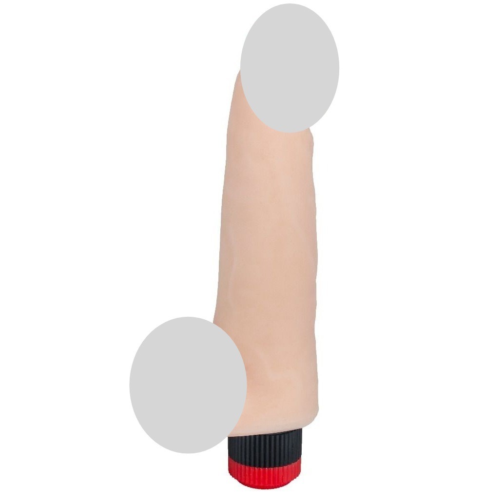 Вибромассажер телесного цвета с мошонкой. Имеет форму члена с ярко-выраженной головкой розового оттенка.