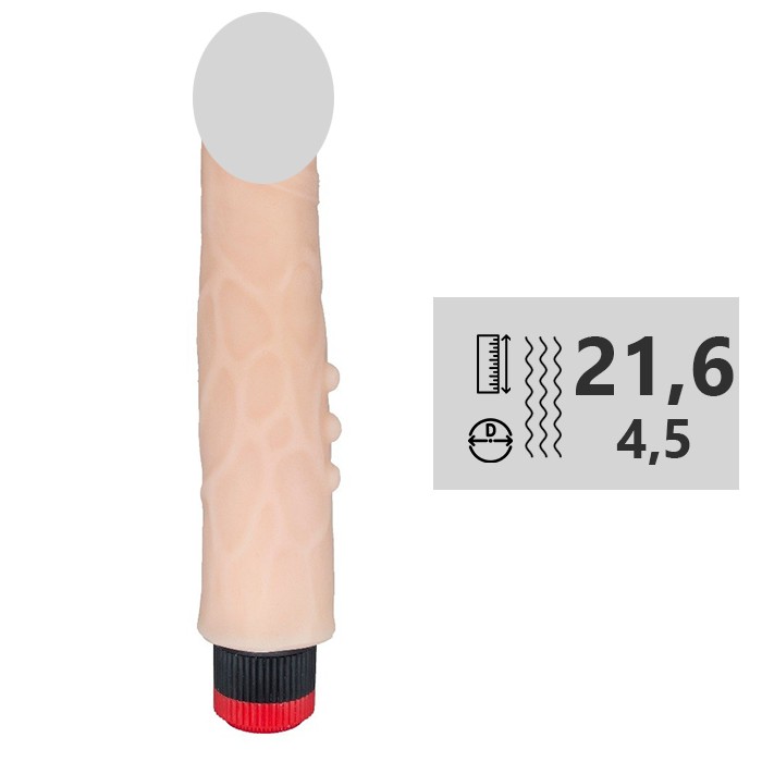 Вибромассажер телесного цвета. Имеет форму члена с ярко-выраженной головкой розового оттенка.