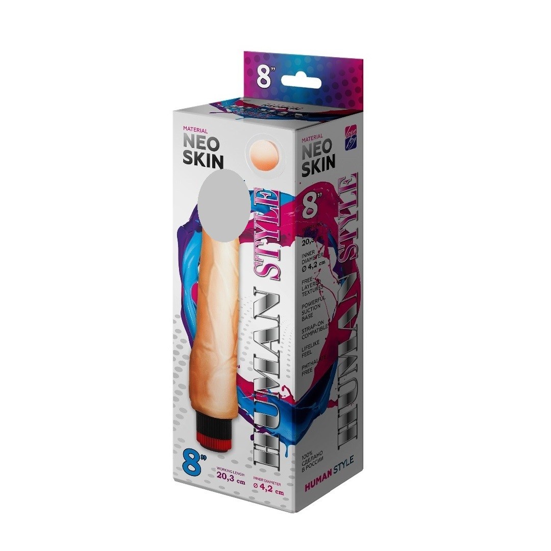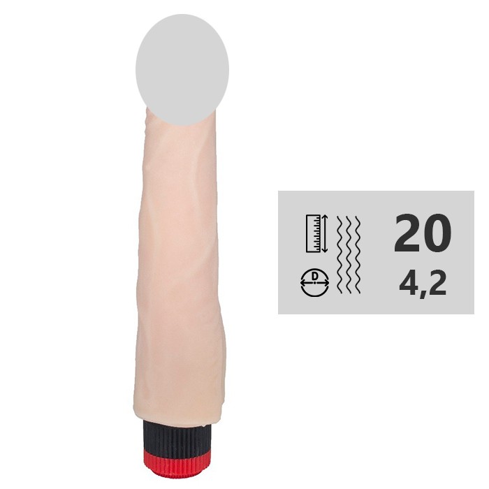 Реалистичный вибромассажер телесного цвета. Имеет форму члена с ярко выраженной, слегка зауженной головкой розового оттенка.
