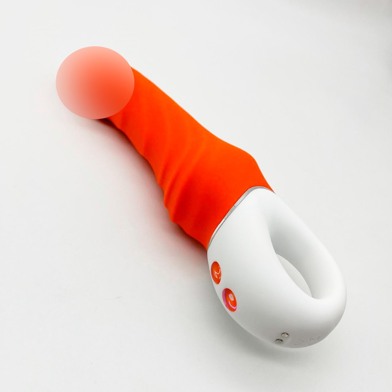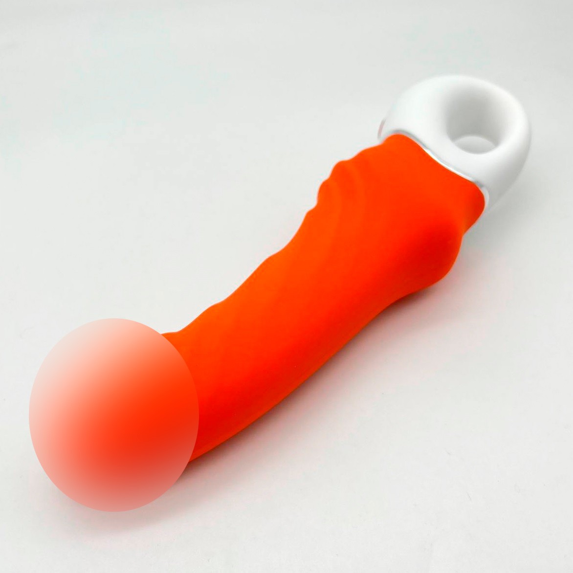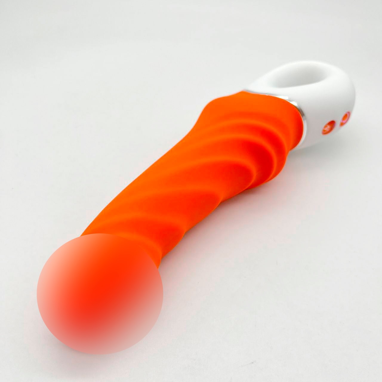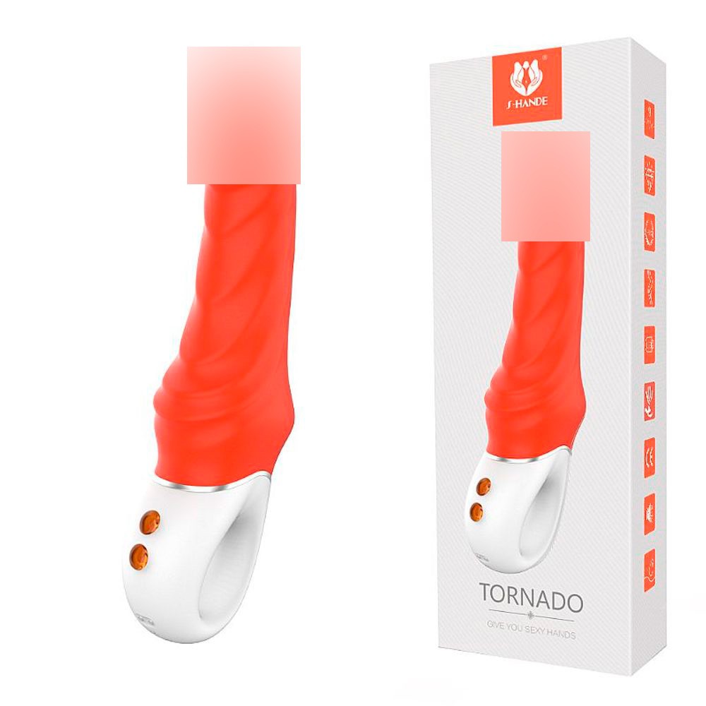Изогнутый ствол вибратора Tornado имеет насыщенный оранжевый цвет с ребристой поверхностью. Кончик с контурами, имитирующими головку мужского члена, легко проникает внутрь влагалища и очень удобен для массажа точки G.